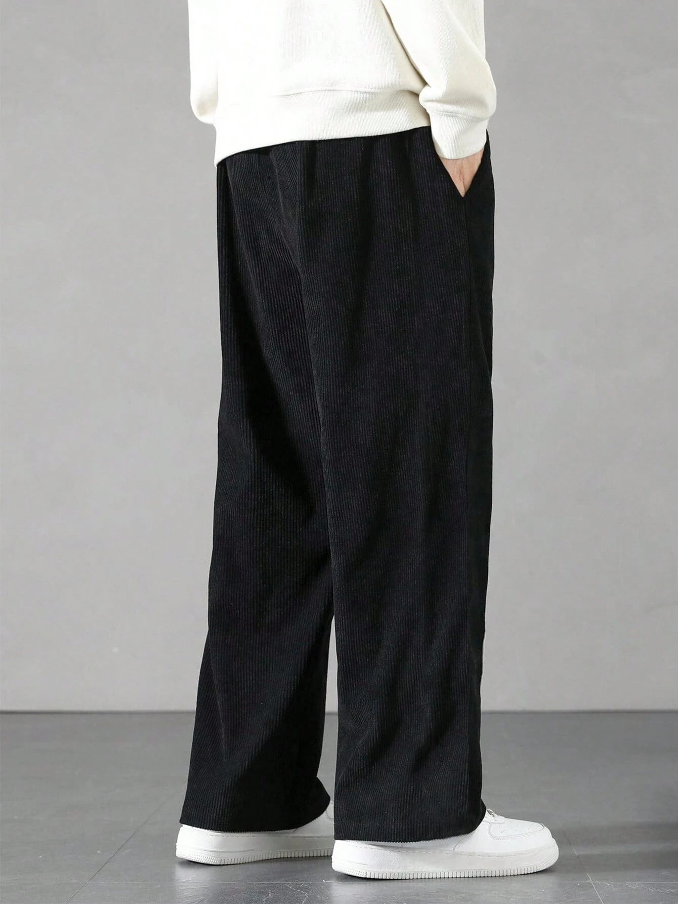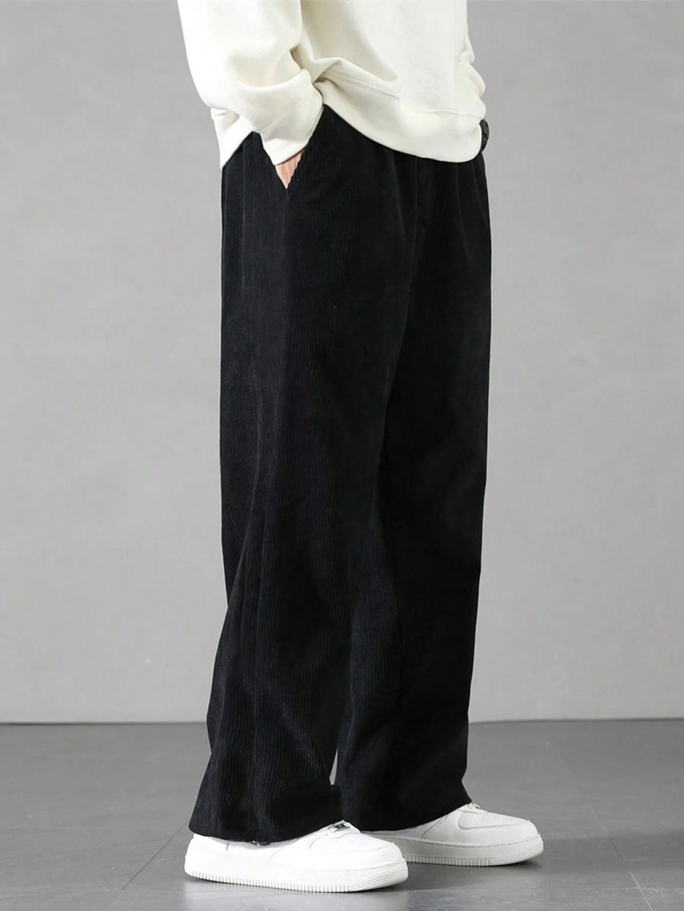 - Caimento fluido, ideal para combinações com camisetas oversized, moletons ou jaquetas.