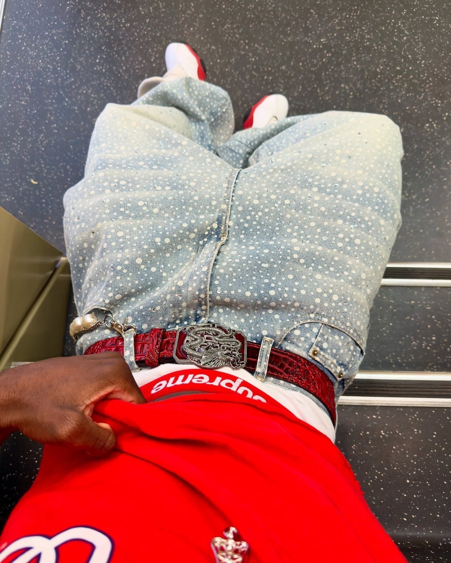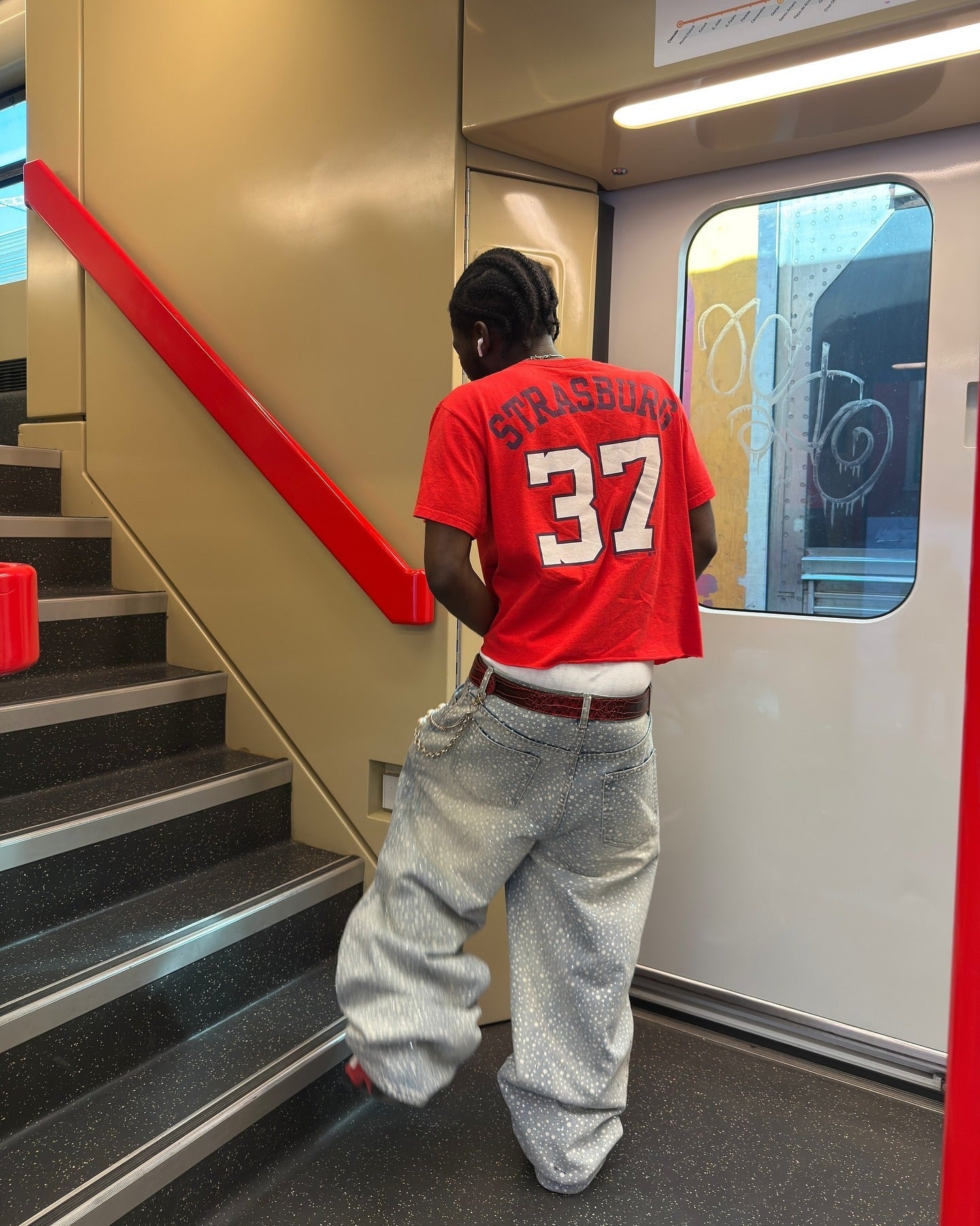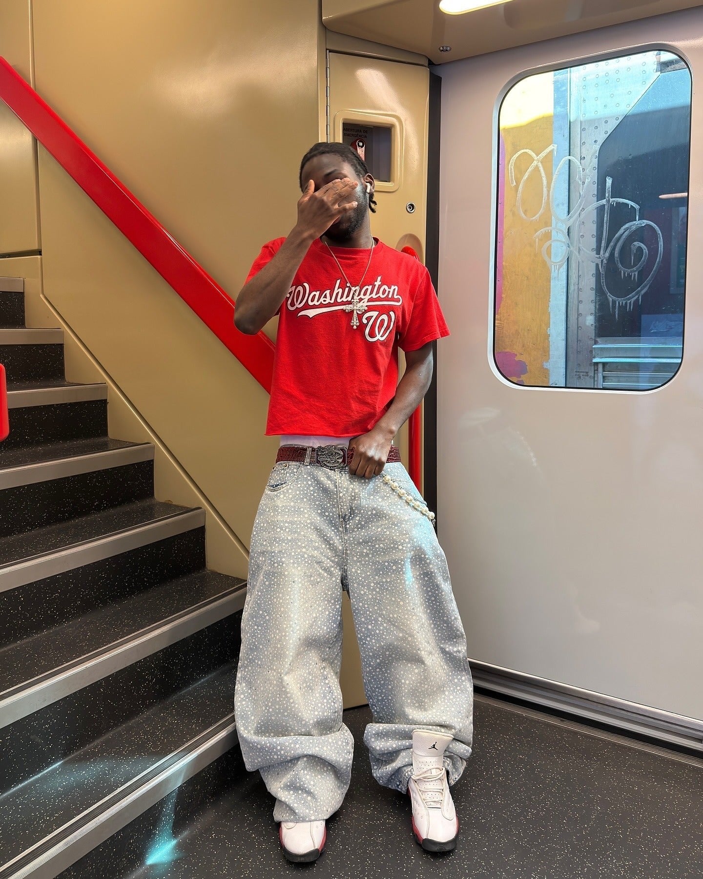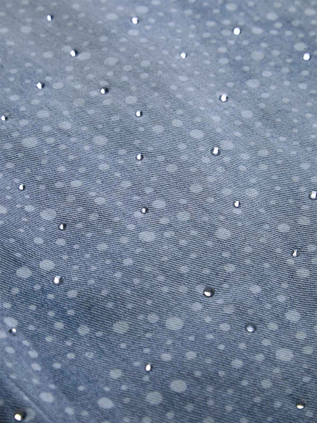 Calça jeans oversized no modelo baggy com efeito artístico de respingos de tinta (ink splashed) e aplicações em hotfix rhinestone, criando contraste entre o estilo urbano e detalhes sofisticados. A estética expressiva une autenticidade street com acabamento premium.