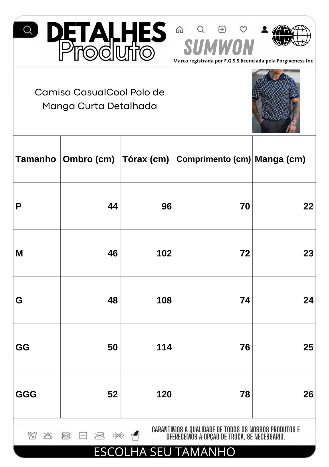 - Tecido de alta qualidade, garantindo durabilidade e caimento perfeito.