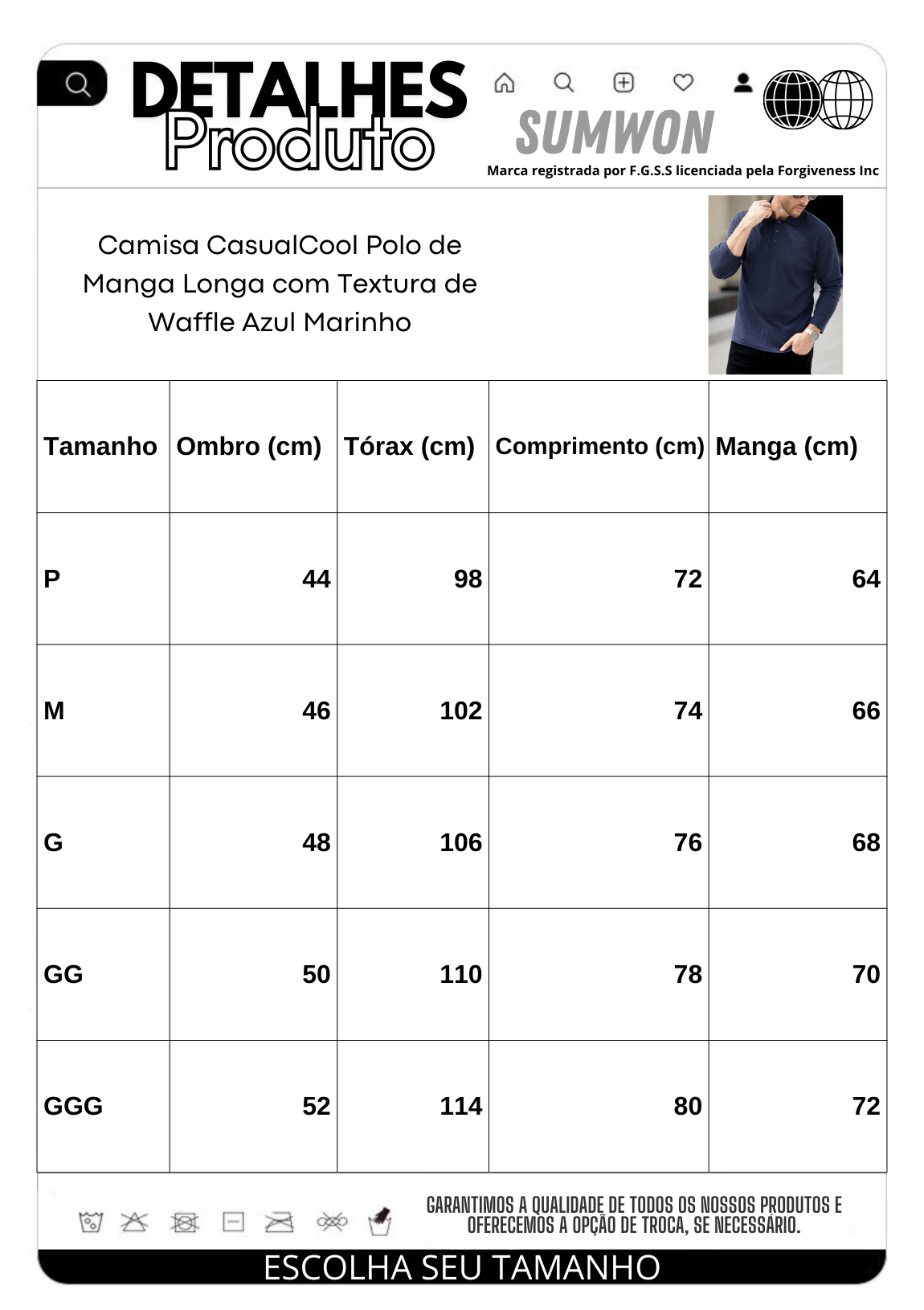 A CasualCool Polo de Manga Longa com Textura de Waffle Azul Marinho é a escolha ideal para quem valoriza elegância e qualidade em cada detalhe.