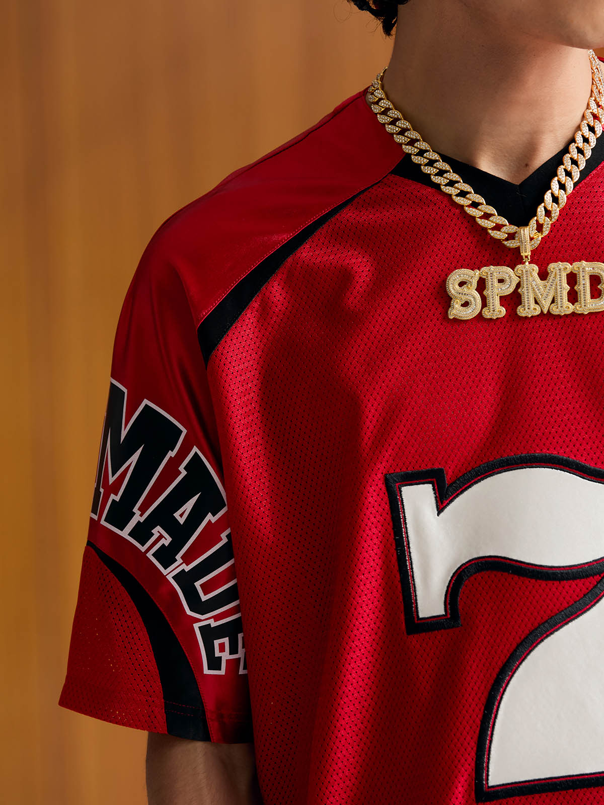 Camiseta oversized inspirada em jerseys esportivas, trazendo o nome Super Seven em destaque sobre a base vermelha intensa. A proposta une o visual atlético com a pegada urbana, criando uma peça imponente que chama atenção em qualquer composição street.