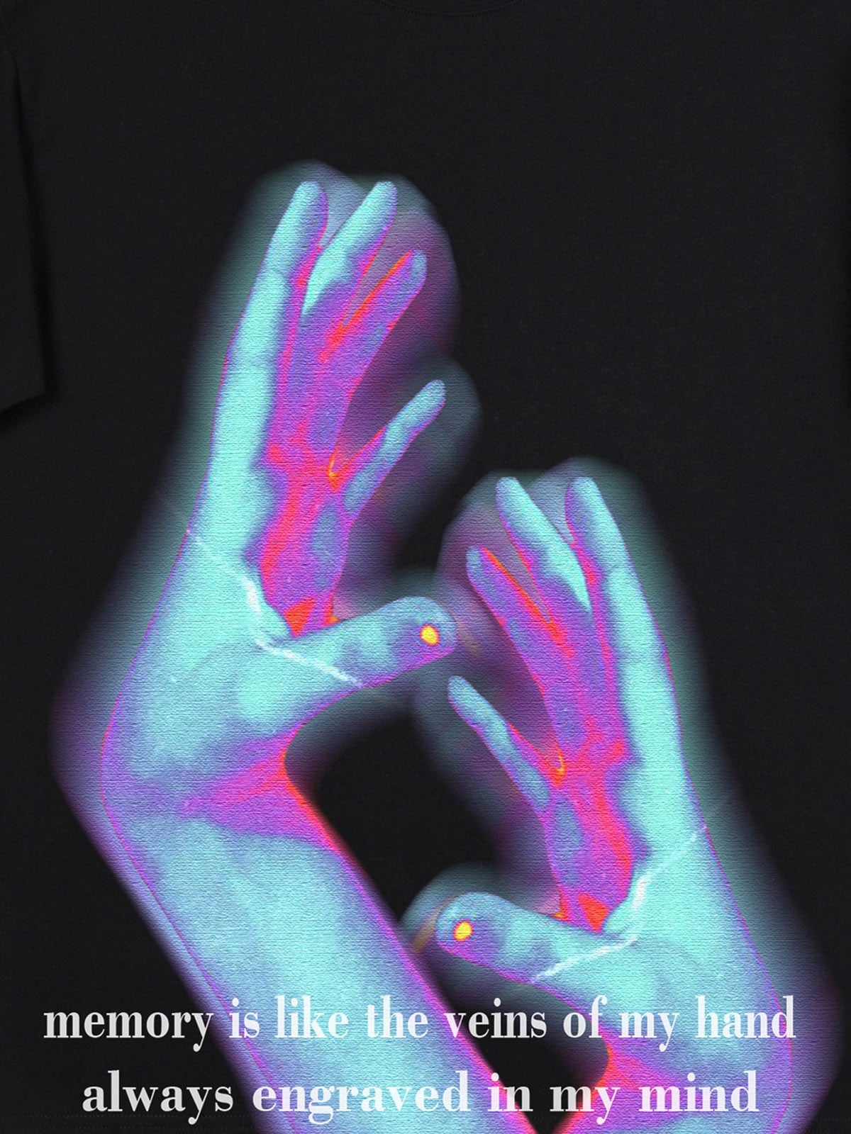 Camiseta oversized com arte 3D psicodélica de palmeiras, trazendo uma estética vintage com visual distorcido e surreal. A composição mistura tons vibrantes sobre a base escura, criando uma peça marcante que chama atenção em qualquer composição streetwear.
