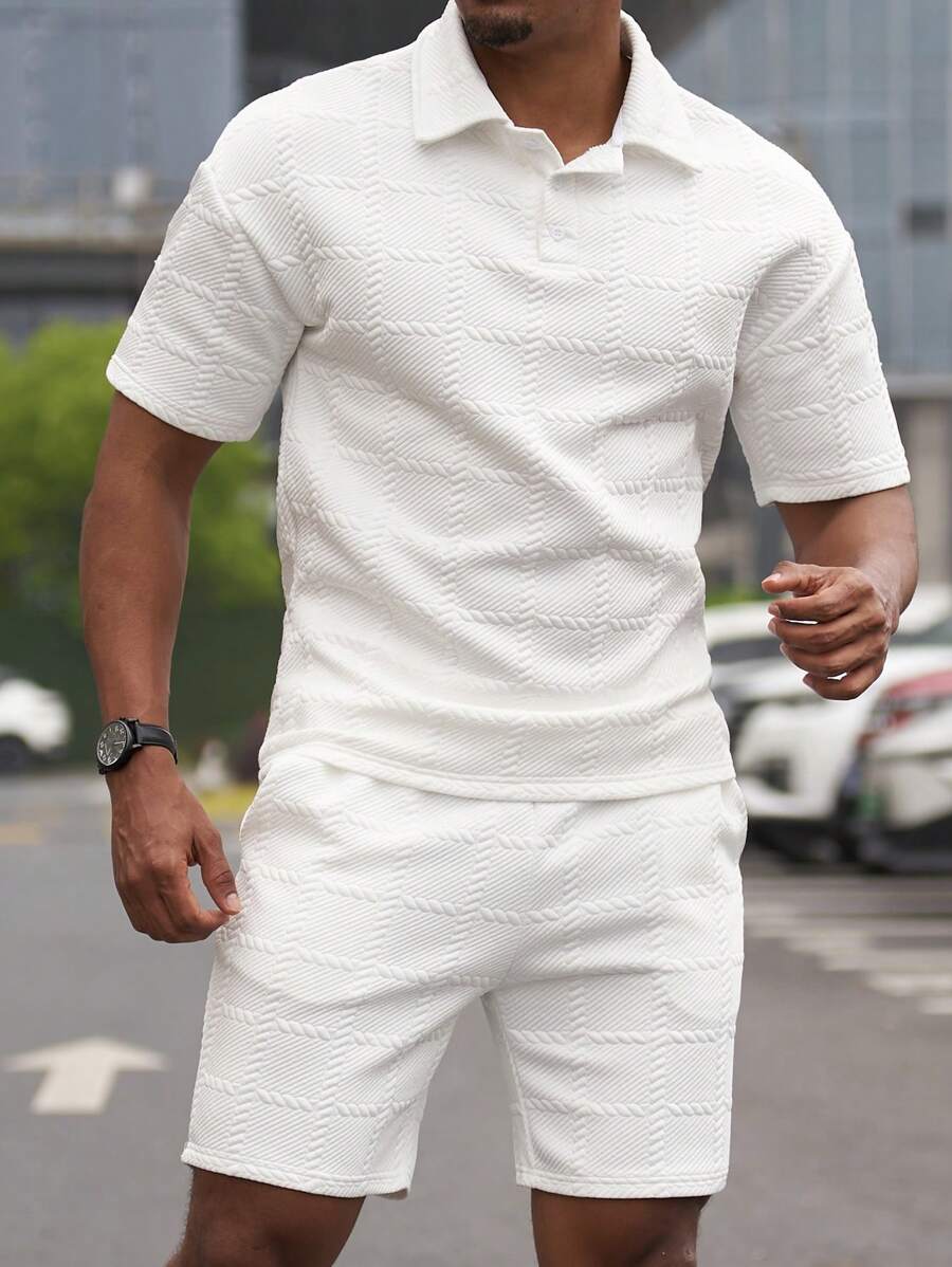 A camisa polo possui gola estruturada e peitilho com botões, enquanto o shorts segue a mesma textura, garantindo um conjunto harmônico que transmite uma imagem de sofisticação e cuidado.