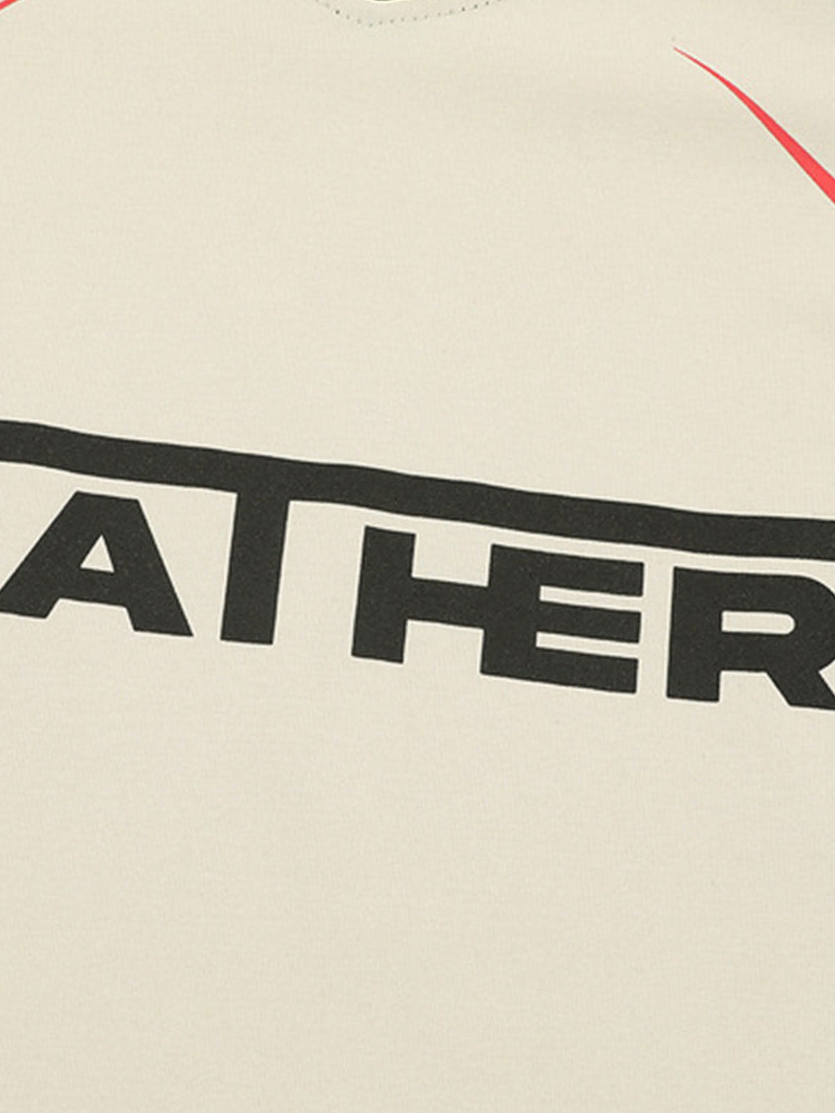 • Design Elements: Bold Red Curved Lines, Central Text Print, Side Text Details