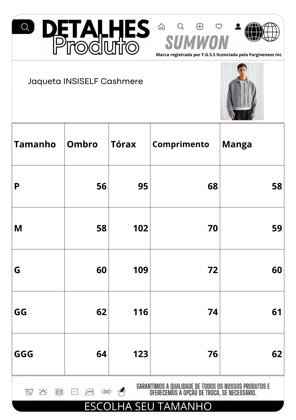 | Tamanho | Ombro | Tórax | Comprimento | Manga |
