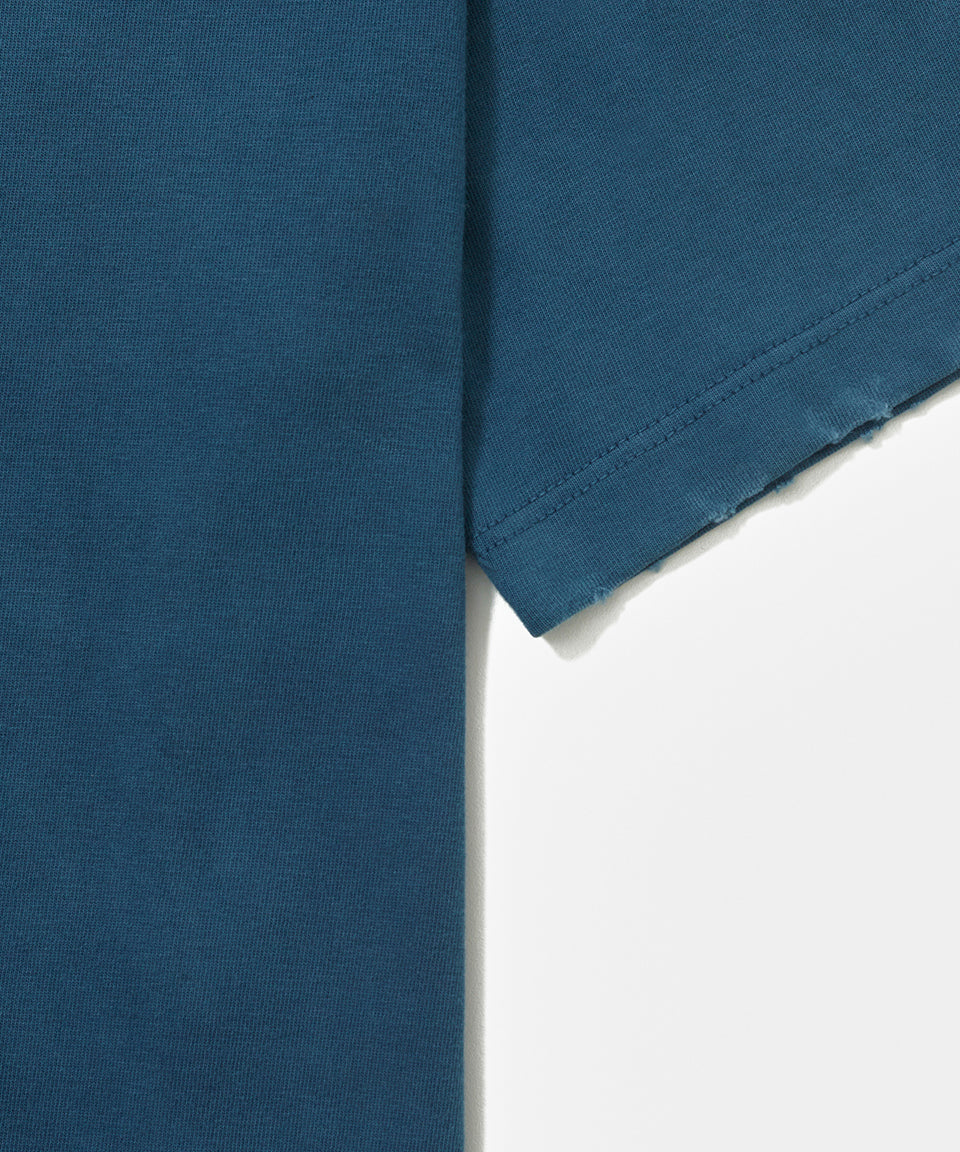 A Logo T-Shirt é confeccionada em malha 100% algodão de 270 GSM pré encolhida. Sua modelagem regular oferece um caimento mais ajustado, com costura alinhada ao ombro e gola de 2,5 cm. Apresenta uma pequena estampa na parte da frente e uma pedra turquesa perto da gola nas costas. A peça possui tingimento estonado e puídos na gola, barra e mangas.
