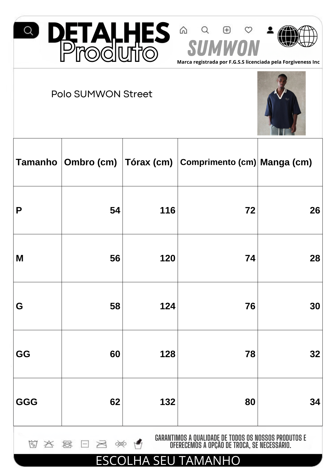 | Tamanho | Ombro (cm) | Tórax (cm) | Comprimento (cm) | Manga (cm) |